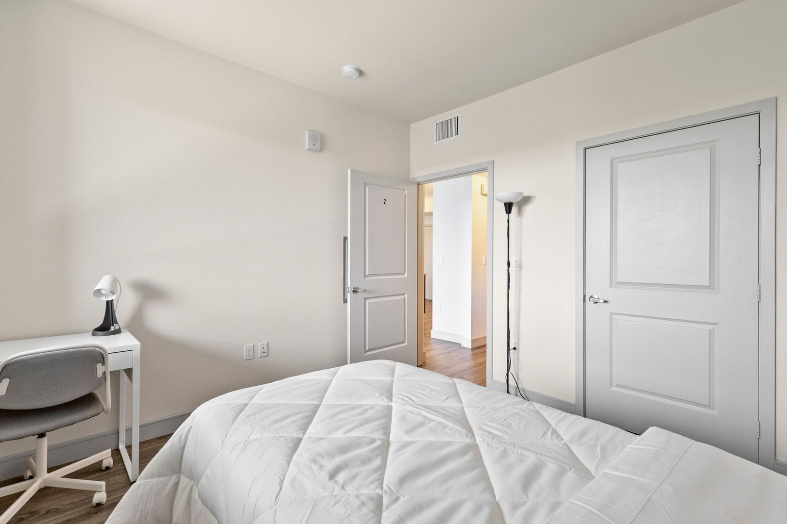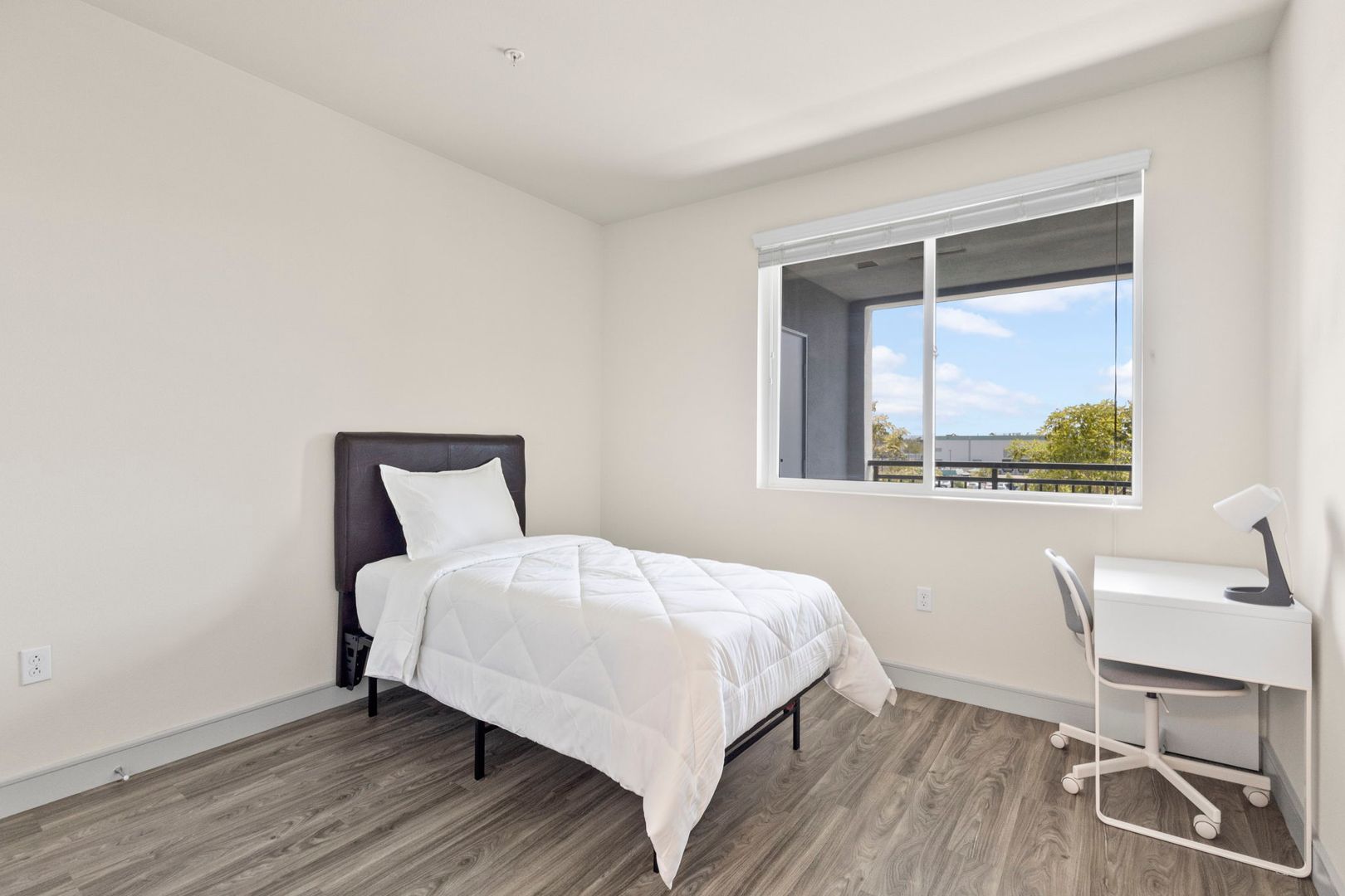 - Furnished with a bed, mattress, desk, and chair