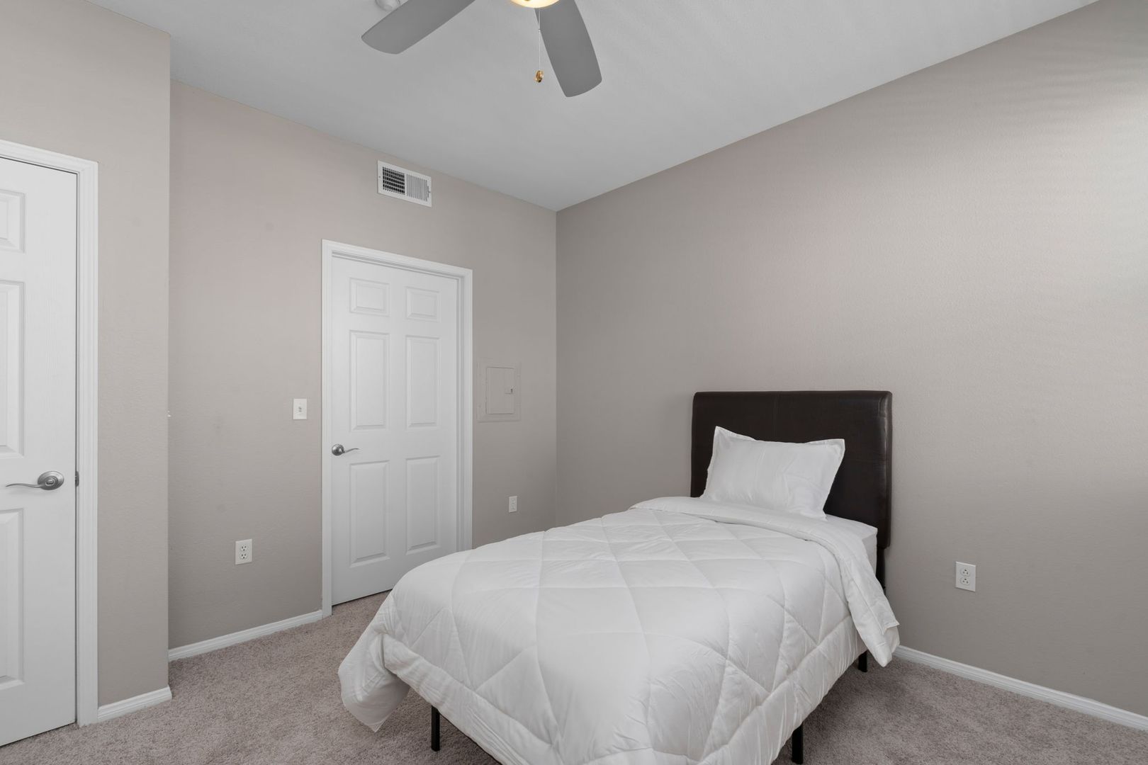 - Furnished with a bed, mattress, desk, and chair