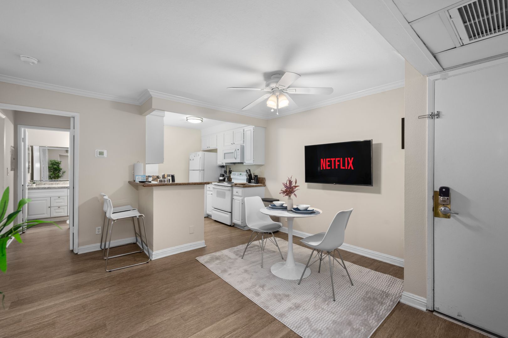 -Flatscreen TV with Apple TV console loaded with streaming services