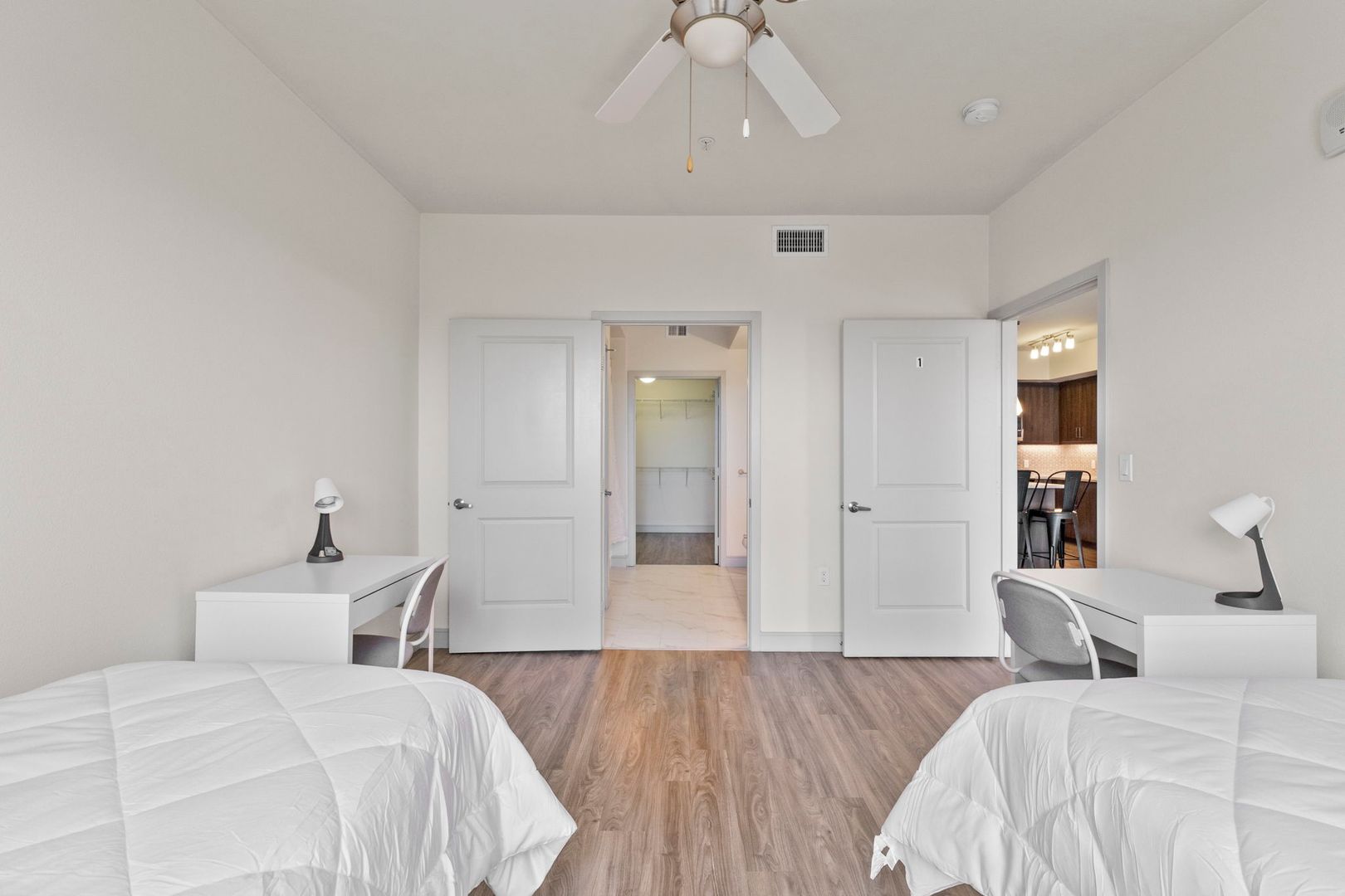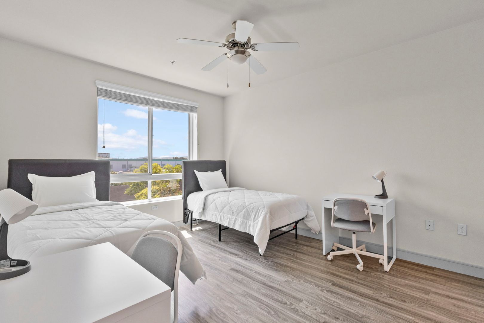 - Furnished with a bed, mattress, desk, and chair