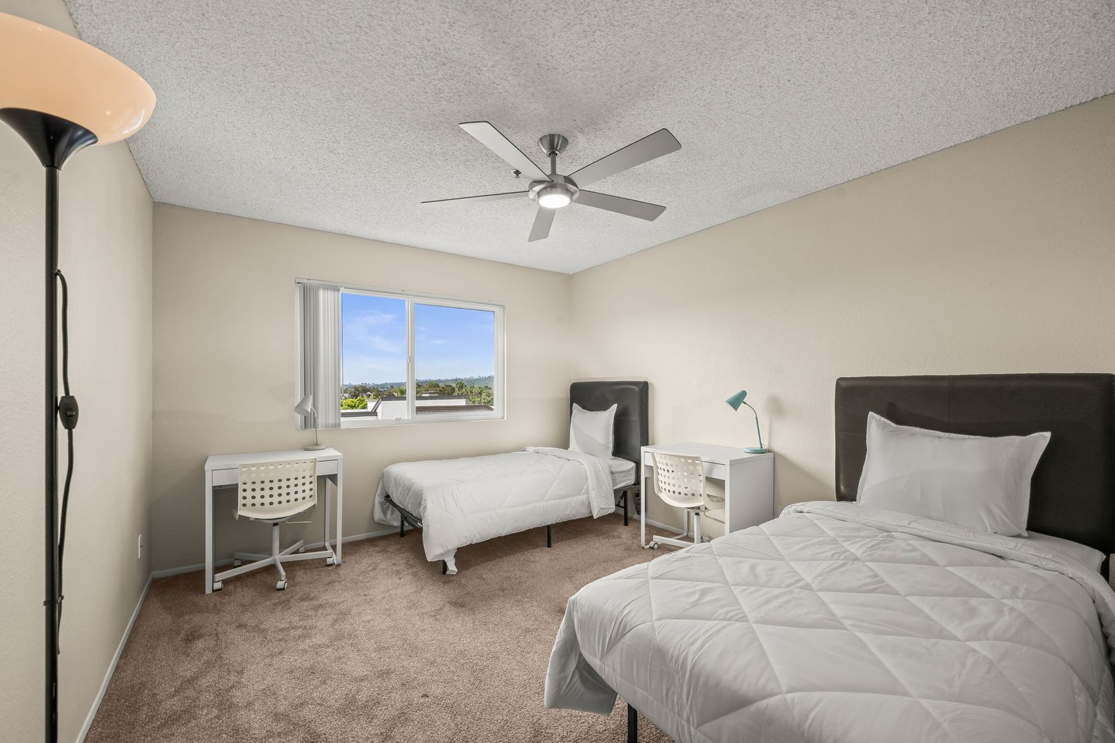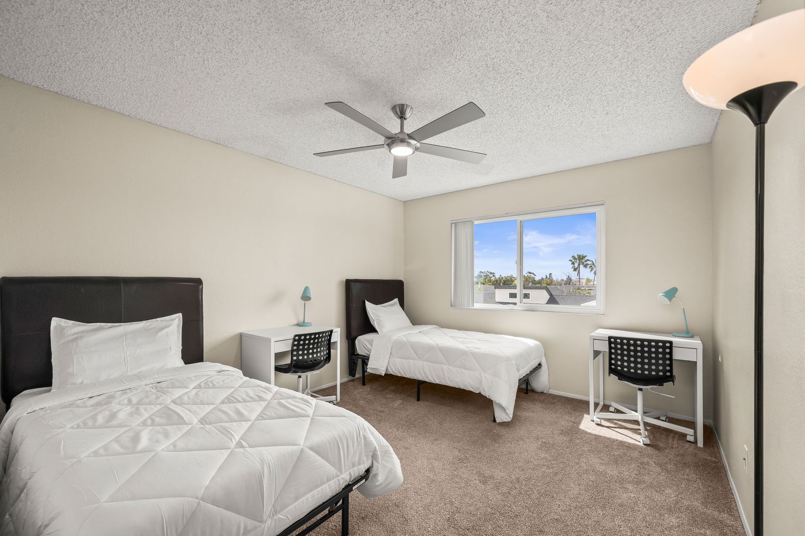- Furnished with a bed, mattress, desk, and chair